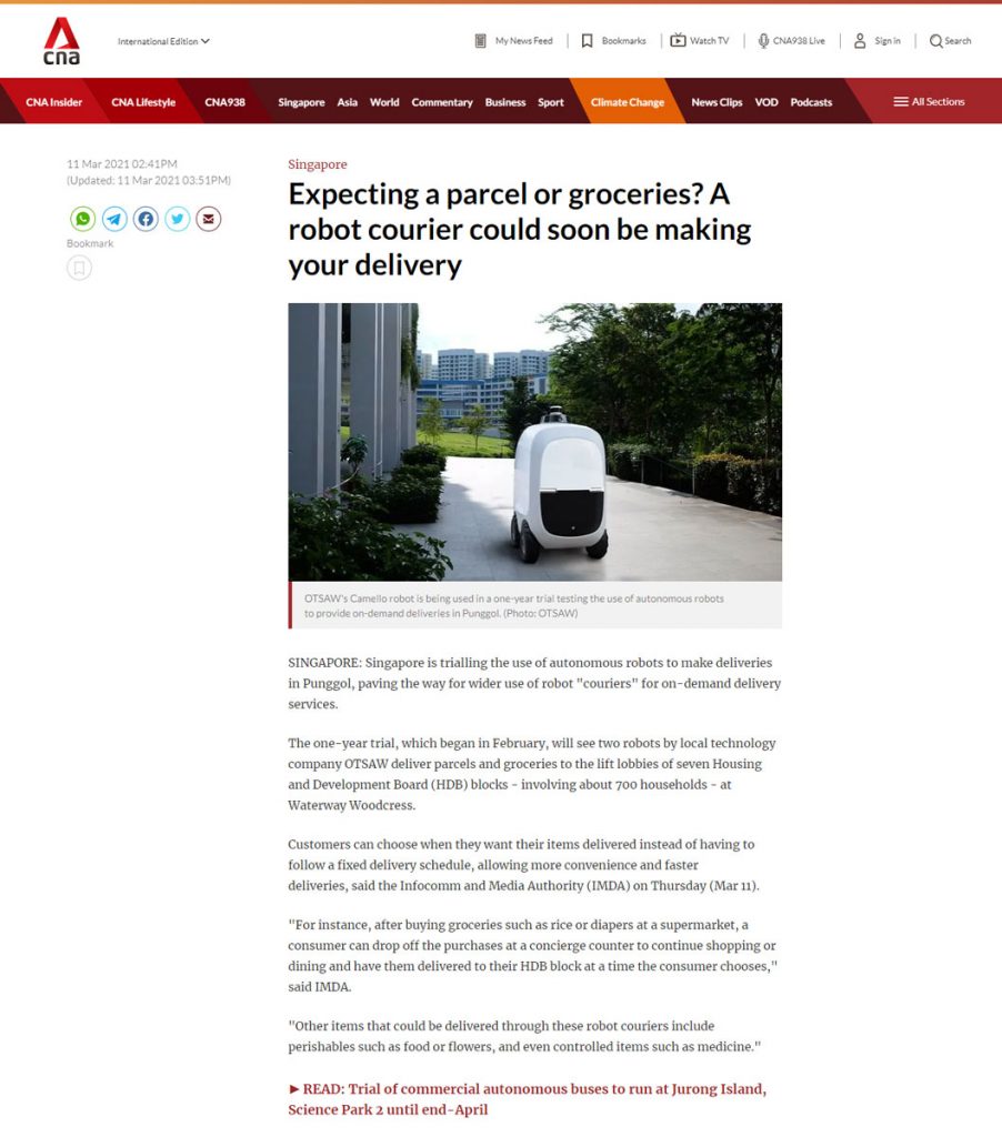 亞洲新聞臺 (Channel News Asia) 特寫報(bào)道了 Activ OTSAW 的 Camello 最后一英里配送機(jī)器人在榜鵝 (Punggol) 的水路田園 (Waterway Woodcress) 的一年試用情況,該區(qū)域涉及 700 個(gè)住戶。